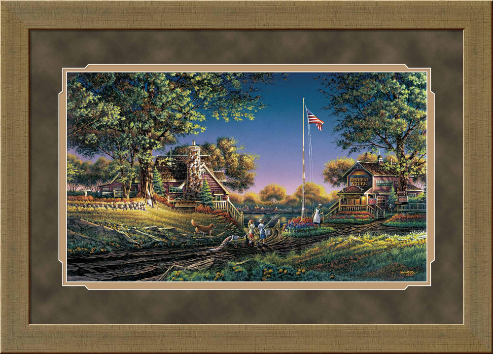 It is early spring and the local lakeside general store is open and ready for the season. From fishing lures to homemade ice cream, the local store is packed full of all the necessities of lake living. Soon the city folk will begin to arrive to spend their summer vacation on the peaceful shores of the crystal clear lake. The storeowner is raising the flag as he does every morning and the children are ready for a fun day of fishing. The birds are singing and the water is calm-it is a perfect spring day.