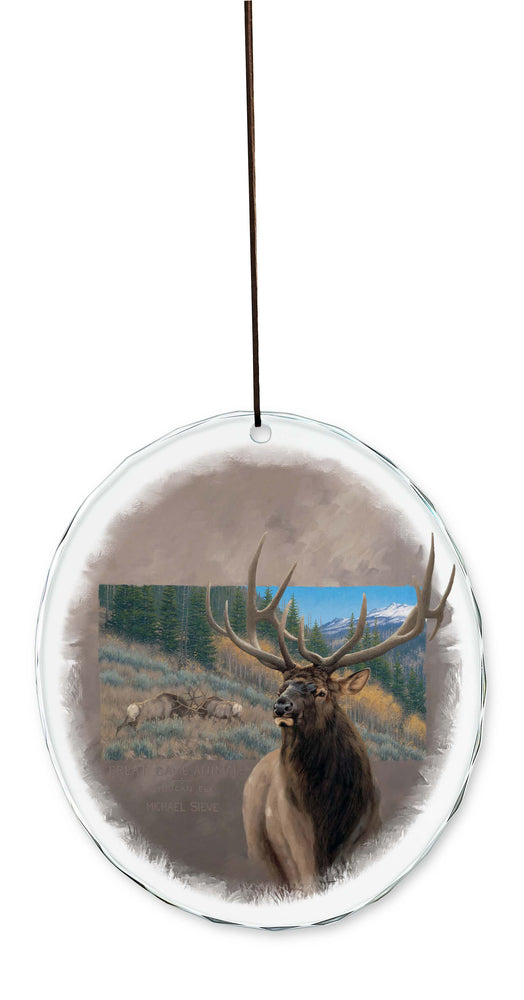 A majestic bull elk in the foreground while two rival elk fight in the background.