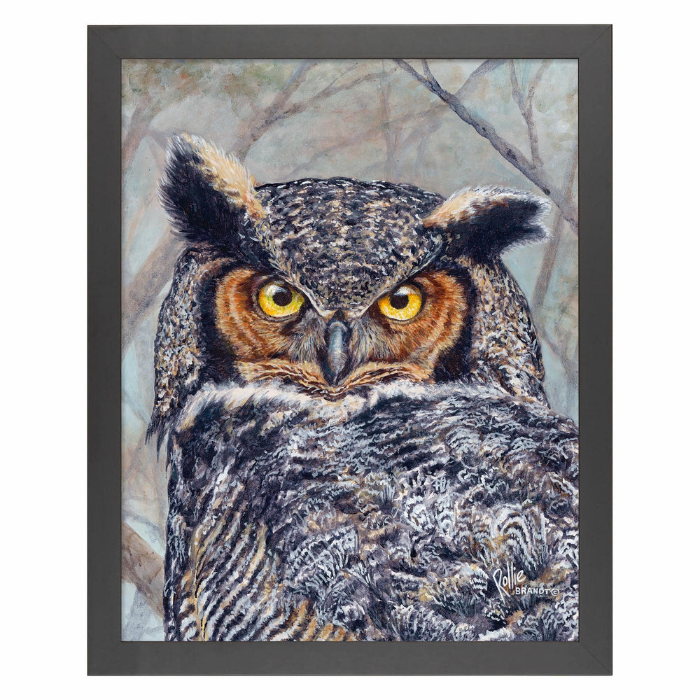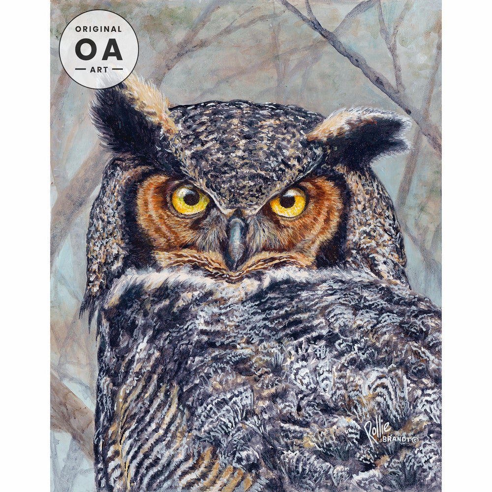 I'm fascinated by owls beautiful large eyes and love to paint them! I had full body photos of both the male and female pair with their family of owlets, but chose to focus on close up portraits of each. I love their expressions and coloring. This painting shows mama turning her head to her left.
