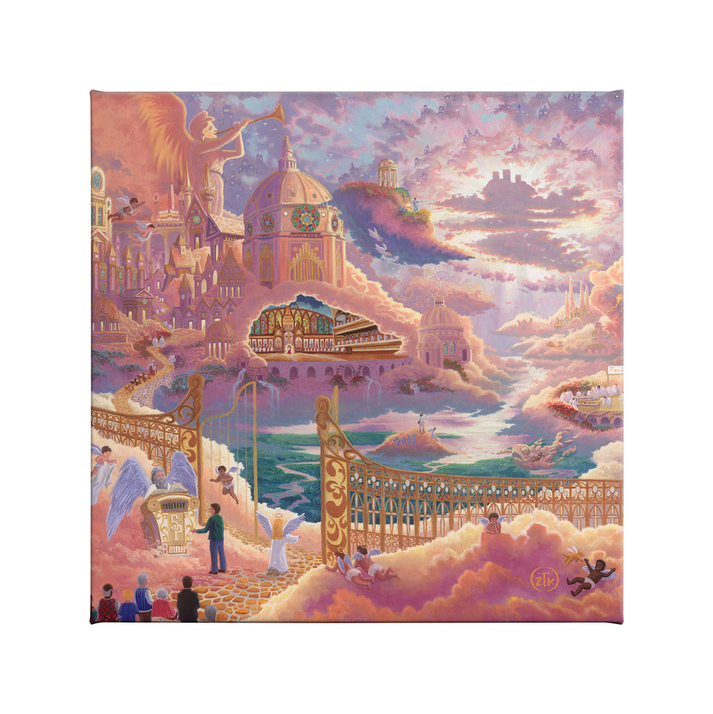 As children we all have dreams of what heaven may be and of what joys we will ultimately find there. For many adults, I believe, those innocent early visions may still hold true later in life. In my latest painting in the Worlds of Wonder series I explore the hereafter as my childhood-self for everyone to enjoy. In Heaven, I embellish all the divine features of eternity that we might learn about in Sunday School with fanciful additions that we can all hope to be part of the Creator’s grand design. Saint Peter watches the “Pearly Gates”, checking the Book of Life for those who may enter. The “Heavenly Host” sings while angels go about their sacred interests. Good dogs and beloved cats await their former masters as a joyous family reunion proceeds in the background. Look closely and see an artist gazing into the sunlit sky, smiling as the glory that is above shines down for all of those still toiling below. Other small surprises are hidden in the clouds, rendered to give a wink to the viewer and maybe hope to some for all that might be. Please enjoy your visit to Heaven, and I want to thank you all for sharing in my adventure in art.
