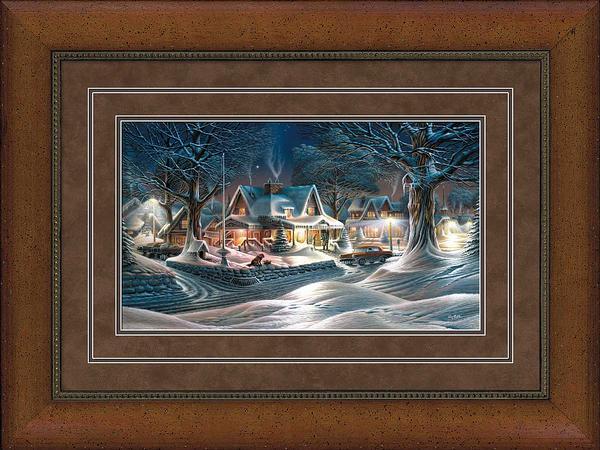 In this, the final painting in An American Portrait, the neighborhood is aglow with lights as families prepare for the upcoming holiday season. The snow glistens in the moonlight and the stars twinkle in the clear night sky. Dad has just finished hanging the homecoming banner. He has been busy all day getting ready for his son's return. The cars are all washed and the garage straightened. Mom has the tree decorated and lit; and from the house wafts the aroma of freshly baked chocolate chip cookies, his favorite. From the window, she sees a car slowly pull up to the front walk. As she opens the door, expecting to embrace her son, she is horrified to see a representative from the Navy and a Chaplain walking up the snowy steps. At this moment, our hearts sink as we realize it is not her son, but the devastating news that he has been killed in war. As her body begins to crumble, she finds herself unable to speak...unable to even breathe. A very old Buddy drops the teddy. He knows his friend is never coming home. 'His Last Good-Bye' immerses us into the pain of this American family's ultimate loss.