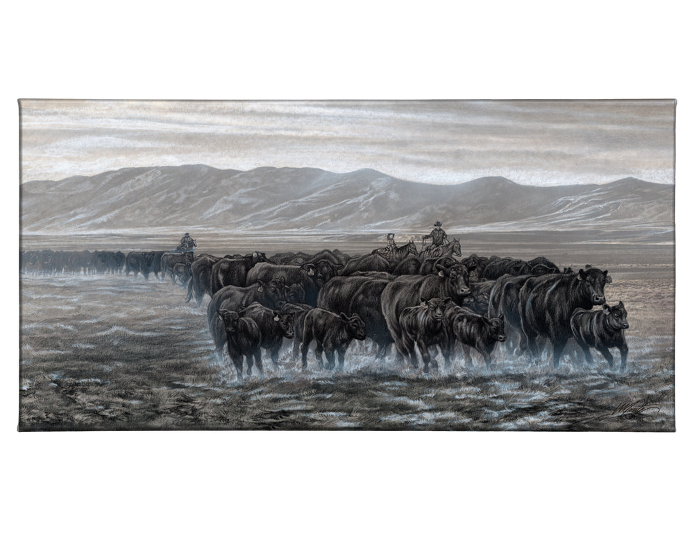This mixed media original by Western artist Monte M. Moore captures the traditions he grew up with on a working cattle ranch in Idaho and showcases the long held traditions of moving cattle with cowboys and horses as they move to new and fresh pasture to graze upon in the final days of summer.