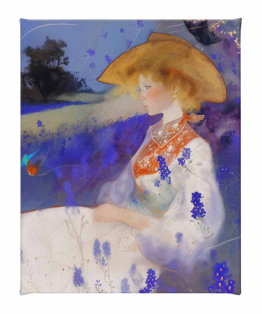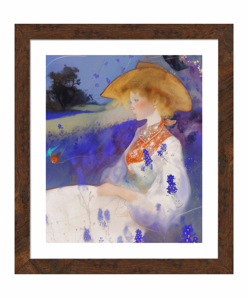 "Homestead Heartache" captures a serene yet melancholic moment, blending the vibrancy of nature with the quiet introspection of its subject. The composition centers on a young woman, dressed in a soft, flowing white dress adorned with intricate red patterns, as she sits amidst a field of deep blue wildflowers. Her posture, slightly turned to the side, suggests a pensive or wistful mood, evoking a sense of longing or reflection.