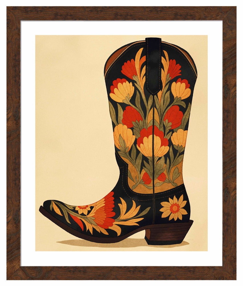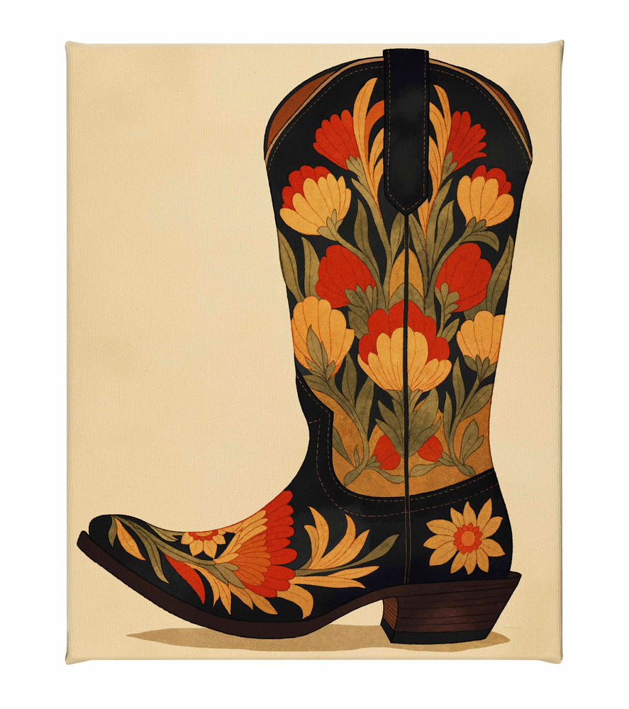 "Honky Tonk Heels" features a striking cowboy boot richly adorned with vibrant floral patterns. The boot stands out against a warm, light beige background, allowing the bold colors of the design to take center stage. The boot’s body is primarily black, providing a dramatic canvas for the bright yellows, oranges, and reds of the floral motifs that cover its surface. The flowers, which seem to burst with life, are meticulously arranged to create a harmonious and eye-catching design. The combination of large, rounded petals and slender leaves creates a dynamic interplay of shapes, giving the impression of movement and vitality.