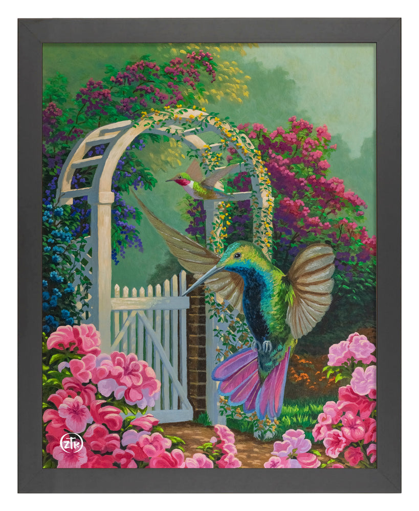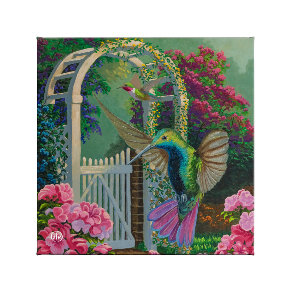 Much like my uncle, I truly enjoy gardens. They are places of perceived peace where renewal can be found in the quiet they seem to provide. I believe that the solitude that could be achieved in a garden was what moved Uncle Thom to revel in their painting and experience. In my view, however, these places take on a different feel and generate a new appreciation beyond what my uncle so richly enjoyed. To me, they are places teaming with an energetic harmony between living things where, if you watch closely, there are all manners of creatures to examine and intrigues to explore. This is so in my painting Humming Along, which is part of my Animal Accents series. In this exploration I worked to capture the magic of a hummingbird in a garden oasis. Hoovering in a way that almost defies gravity, a little avian denizen living in my imagined garden steals honeysuckle from a springtime flower and in doing so works to pollinate and spread the food source which helps sustain it. As the humming bird darts about the day, other birds look on and add a cacophonic sound-tract the events that are unfolding. The activities fit each other well and so meld to create the initial peace simply experienced but far from simple in its nature. I hope you enjoy my vison of the spring garden and I want to thank you for sharing my adventures in art.