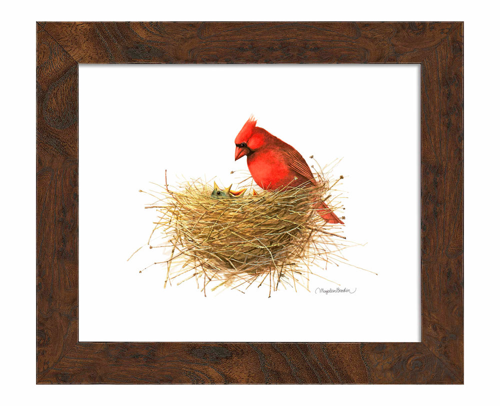 The Northern cardinal has been a busy bird this spring. His impressive song has been a constant reminder of his presence around the house for several months now. The male, dressed in a beautiful bright red coat and festive crest, is inspecting the nestlings that hatched about a week ago. This is their first brood of the year, a second is likely and some cardinals even have three every year!