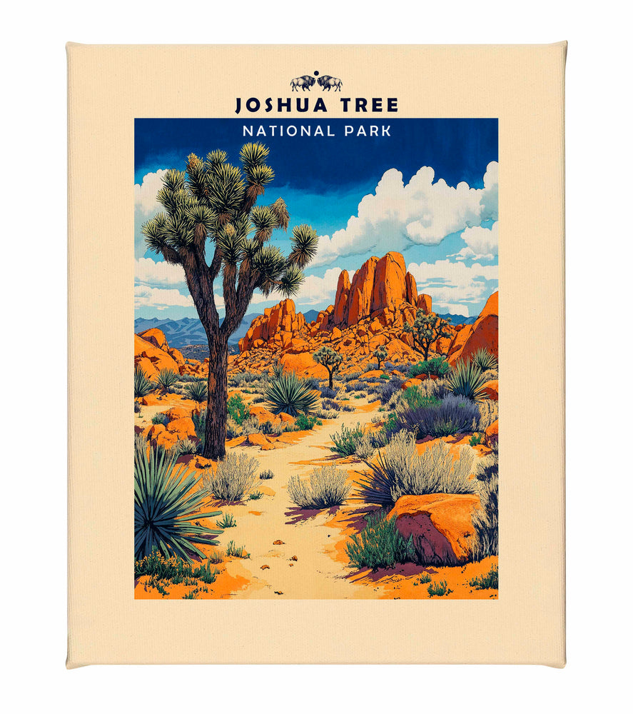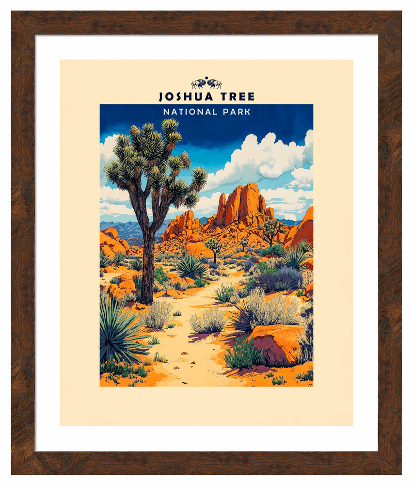 This vintage-style poster art of Joshua Tree National Park vividly captures the unique beauty of the Mojave Desert landscape. The composition is dominated by an iconic Joshua tree in the foreground, its distinctive silhouette standing tall against a bright blue sky dotted with puffy white clouds. The background features the park's famous rock formations - large, orange-hued boulders stacked in surreal arrangements. The desert floor is richly detailed with various cacti, shrubs, and smaller rock formations, showcasing the diverse plant life that thrives in this arid environment. The artwork's color palette is warm and vibrant, with orange and yellow tones of the desert sand contrasting beautifully with the deep blue sky. A winding path through the scene invites the viewer to explore the park's rugged terrain. This poster effectively conveys the otherworldly charm of Joshua Tree, highlighting its distinctive flora and geology, and enticing visitors to experience the stark beauty of this desert wilderness firsthand.