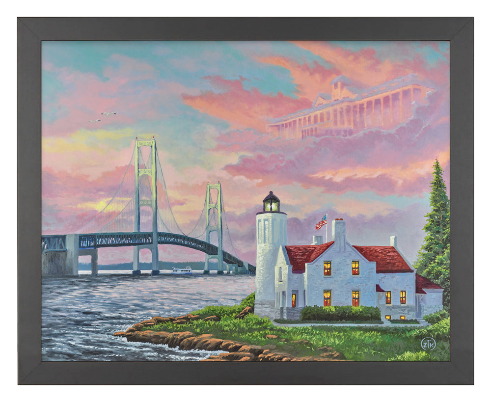 In the Straights of Mackinac and at the juncture of Lake Michigan and Lake Huron exists the Old Mackinac Point Light, a once proud sentinel warning passing ships of rocky danger as they steamed by the island on which it was constructed. Built in 1892 but still abiding on Mackinac Island as a tie to its historic past, the structure is beautiful and well worth my efforts to capture it in oil. I did not stop there, however. Its surroundings are so impressive that I decided to paint beyond the simple light and attempted to capture the island more in its entirety. The Mackinac Bridge, “Big Mac,” spans the straight connecting the once far-removed coastlines of Michigan’s upper and lower peninsulas. The beauty and size of this suspension is unrivaled. And should you desire to take it all in with afternoon tea, the is no grander place than on the porches of the hotels on Mackinac. I love to travel and share my experiences. I hope you enjoyed this one. Go to Mackinac Island and relax, eat fudge, and enjoy the romance. And, as always, thank you for sharing my adventures in art.