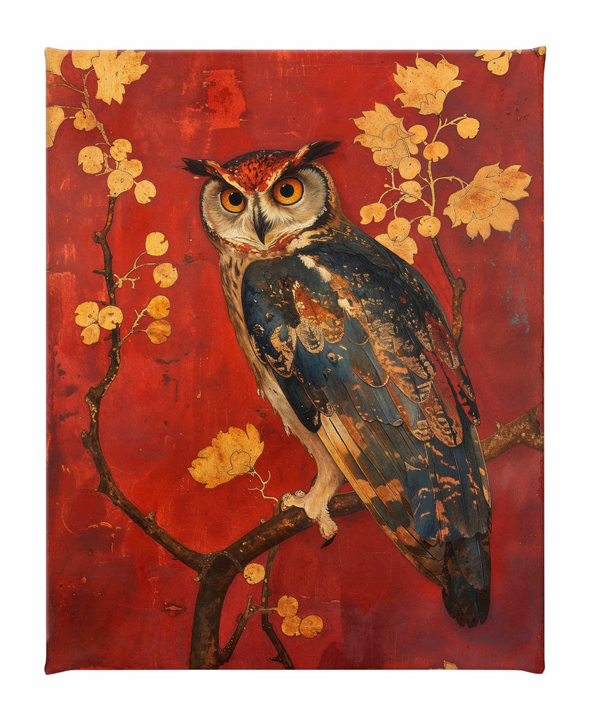 Majestic Watcher - Owl in Golden Foliage is a stunning piece from the Silk Road Collection, capturing the dignified presence of an owl perched on a branch amidst delicate golden leaves. The owl, with its striking orange eyes and richly colored plumage of deep blues and browns, is meticulously detailed, highlighting its wise and watchful nature.