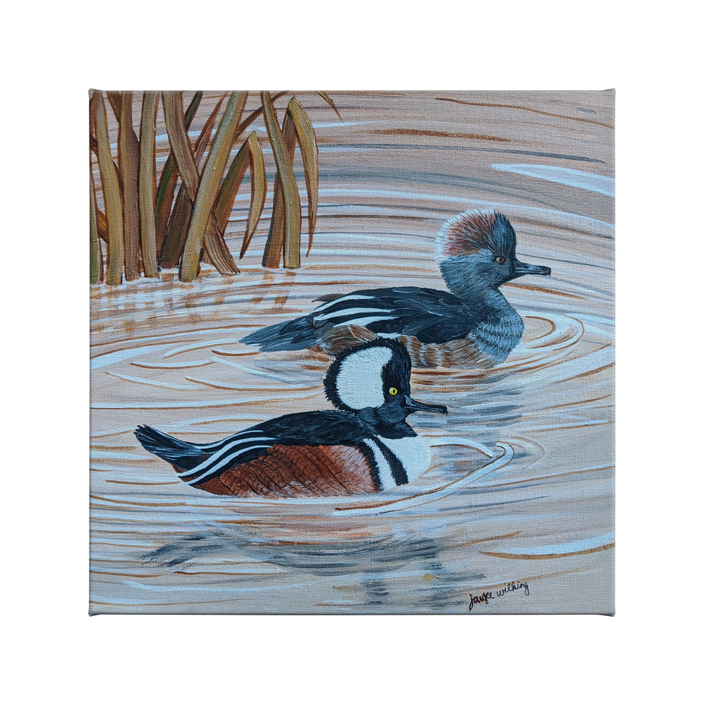 Hooded Merganser Couple Swimming - Hooded Mergansers are the first ducks to return to our central Minnesota lake in the spring. We enjoy watching them try to get attention with their mating dances or chasing unwanted attention away. It's very interesting to watch the different shapes they make with their fan shaped crest. It almost makes their head look to big when it's completely open or they can collapse it down almost flat.
