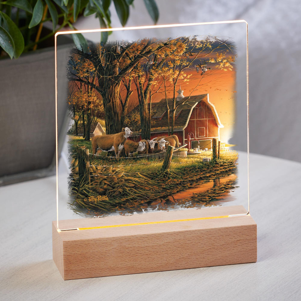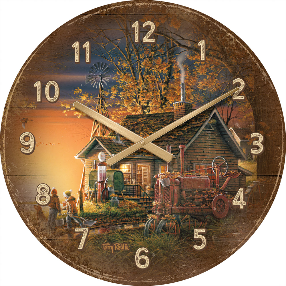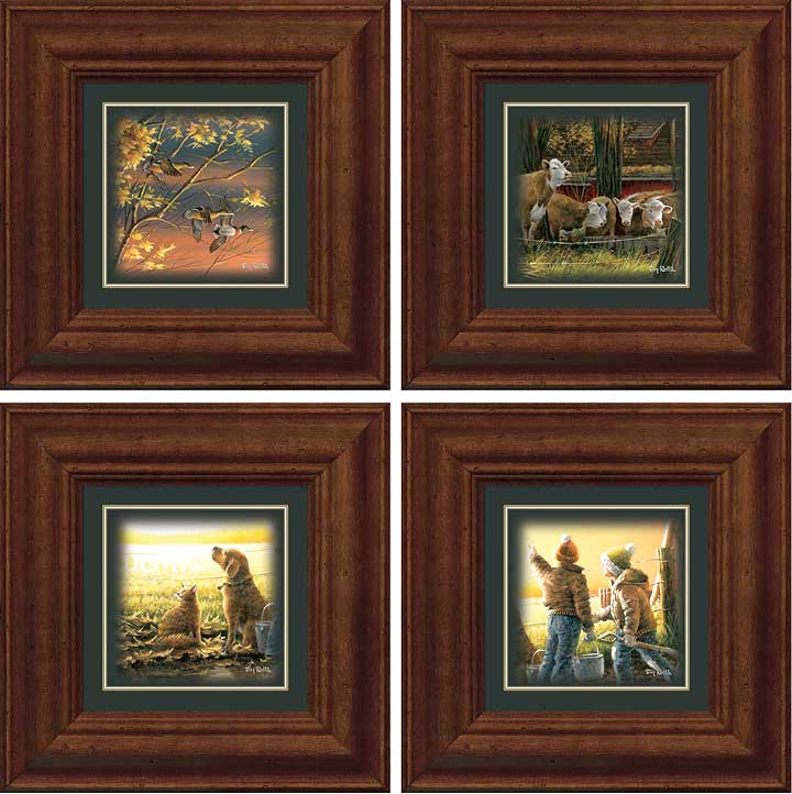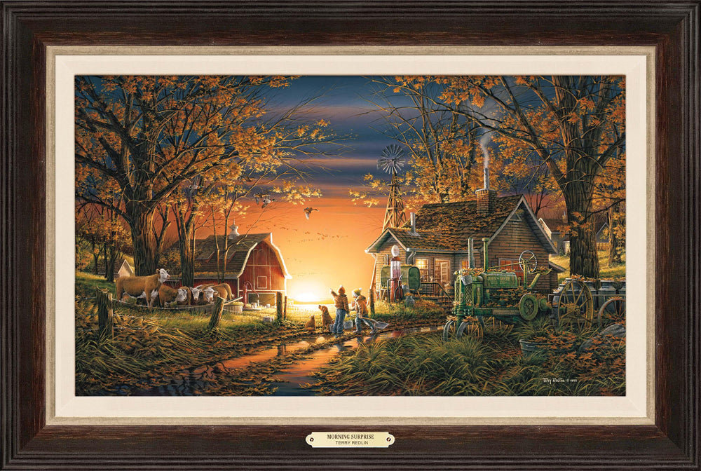 Throughout the night leaves have been falling and rest gently on the milkhouse roof and tractor hood. The two children have begun their morning chores. Suddenly the still air is broken as five mallards wing low through the trees. In startled surprise the children and pets look up to catch a fleeting glance. In a morning blink all is again silent and the business of the day will continue. Only the windmill's rotating squeak is heard as water cools the fresh milk stored in the pump house. On the porch cats wait patiently to enjoy any spillage. The artist remembers this idyllic scene from visits to his uncle's farm. I was just a small boy then, he comments. It was a wondrous time of day and, I think, God is very close on a morning like this.