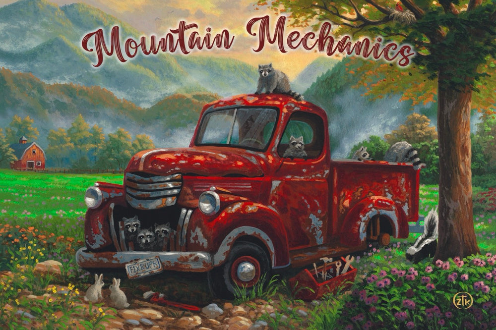 Mountain Mechanics is another example of such a happening, proving itself both a happily discovered experience and an eventually treasured reminiscence. Various critters gather and commune with each other in a shady spot. An abandoned truck serves as a curiosity for a band of mischievous raccoons. A toolbox sits nearby to help the gang of potential joy-riders ready their vehicle to hit the road.