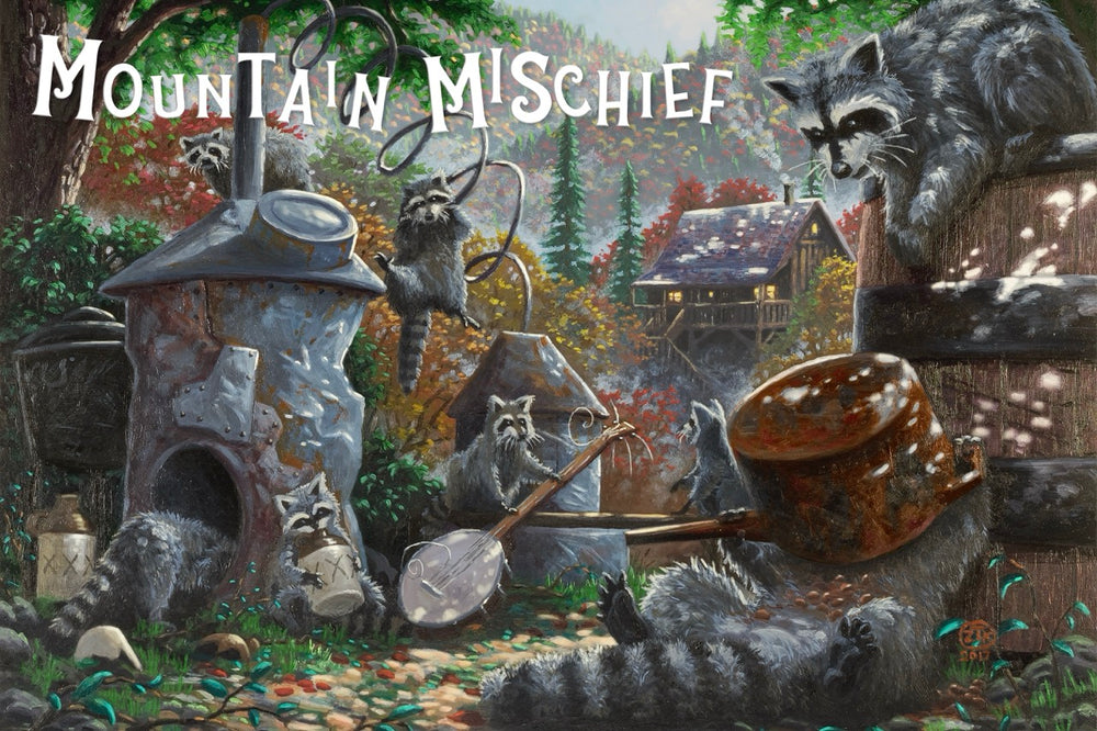 I love the hills and valleys you find in the Ozarks. The grand vistas, the fall colors, and the dappled sunlight as it falls into the hidden forest places all give a sense of adventure and fun to the viewer. You can lose yourself there and feel removed from anything but the wonderment around you. I am also fascinated with mountain life; both the people who live in these "places apart" and the "critters" that share in their existence. "Mountain Mischief" is my vision for this way of being. In it, a gaze of raccoons plays merrily with some old equipment left unattended by the folk of their "hallow". Whether by starting a "jug band" or by investigating their new-found spoils, this rollicking group is assured to wind up finding trouble from their behavior. I can almost hear the shouts coming from the distant cabin as the ring-tailed "party" is discovered. And, I see the commotion that ensues as the evening shadows swallow this mischievous menagerie scurrying away and leaving a trail of chaos behind. In "Sunlight" or with "Moonshine", I hope my Ozark Mountain story makes you smile each time you take a moment to visit. And, as always, thank you all for sharing my adventure in art.
