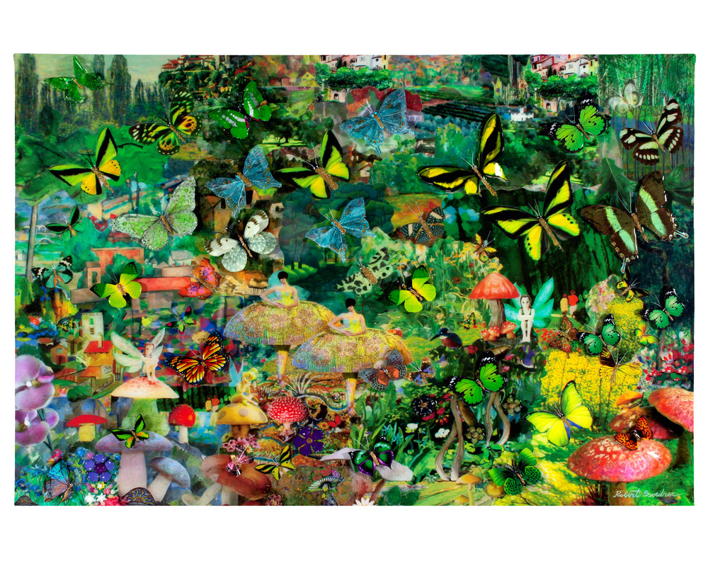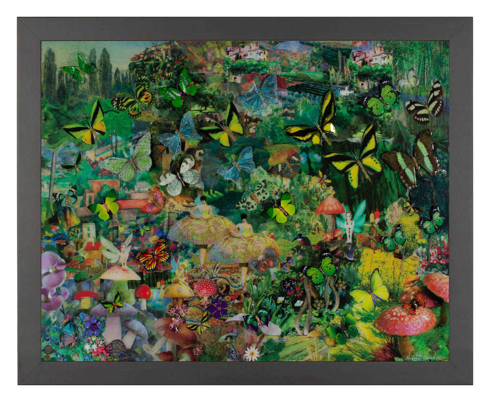 When creating my collage art, I take a surreal approach and avoid dictating what the viewer should see. Instead, I aim to draw them in and encourage them to discover new elements with each viewing. One of my pieces, Mushroom Dancers in a Butterfly Forest, features Ballerina Dancers showcasing a whimsical forest brimming with my favorite natural wonders. Vibrant mushrooms adorn the ground while butterflies flutter about, contrasting beautifully against the forest's rich colors. A visit to this butterfly forest will always reveal something new.