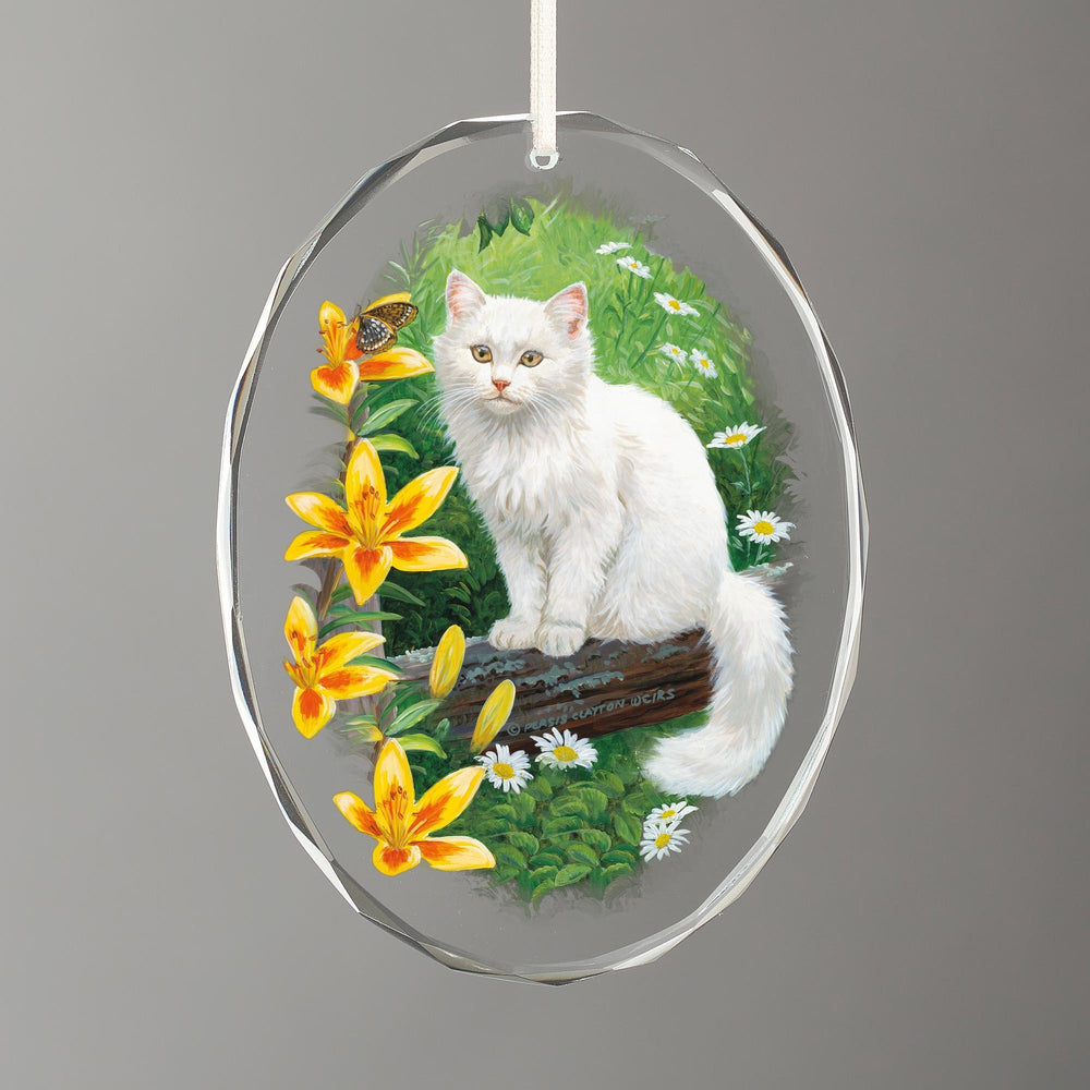 A long-haired white cat intently studies a butterfly as it busily visits a lily.