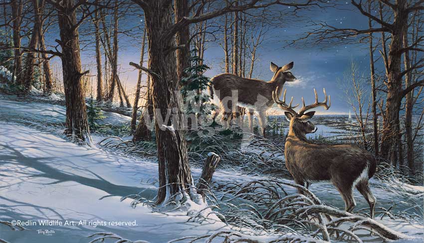 It's that special time in early evening when the western horizon still reflects a dim light and the stars are beginning to assert their rightful presence in the night sky. Standing in silence, the two white-tailed deer watch this transfer of colors and listen to faint sounds from the small town in the flats.