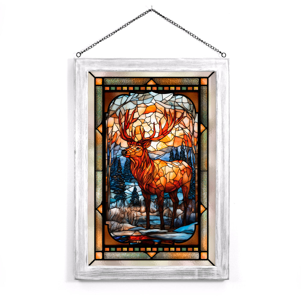 "Northern Elder" depicts a majestic stag standing tall amidst a serene winter forest, bathed in the warm glow of a setting sun. Rendered in a stained glass style, the piece beautifully contrasts fiery amber and rich chestnut tones of the stag with the cool blues and whites of the snowy landscape. The intricate details and luminous colors evoke a sense of wisdom and strength, symbolizing the enduring spirit of the wilderness.
