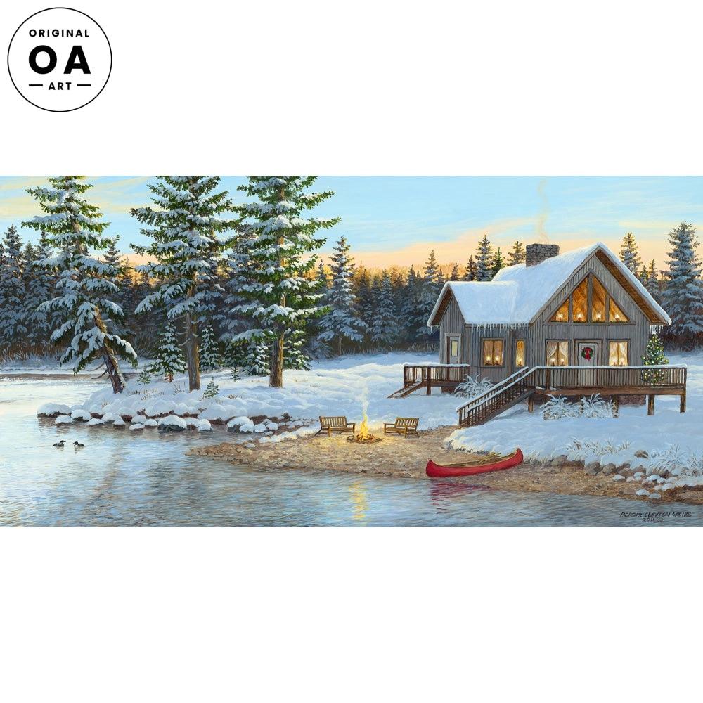 A winter portrait of a cabin on a peaceful lake of the northern woods.