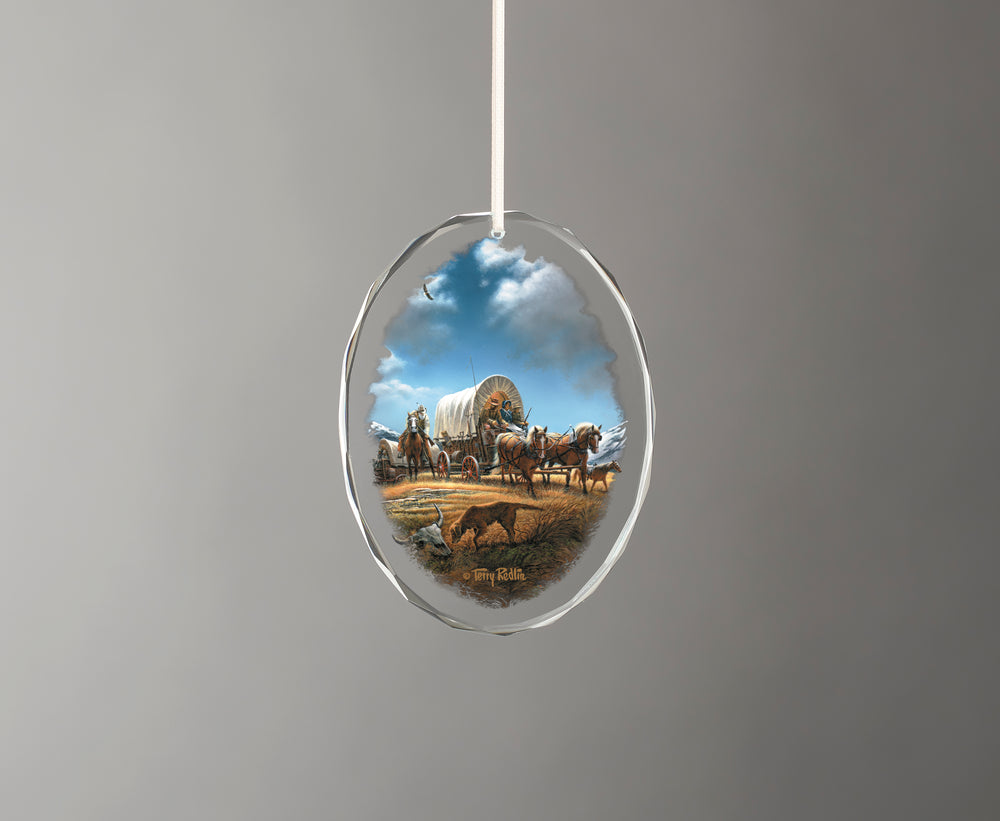 “I have great admiration for those pioneers who left the security of their homes and headed west in covered wagons. So much land, so much sky. A whole new world opened up to them. This picture attempts to capture that sense of adventure and the grandeur of the immense western landscape. As one of the guides inspects a wagon wheel and talks with the driver, a lone eagle soars high overhead, symbolizing a sense of freedom that the young country was experiencing.”