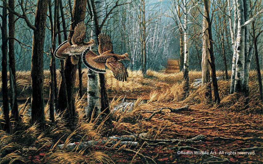 Winding through the trees with the sun breaking on their backs, a pair of grouse take advantage of the clearing made by early loggers. This painting was created from an actual scene near the artist's cabin.