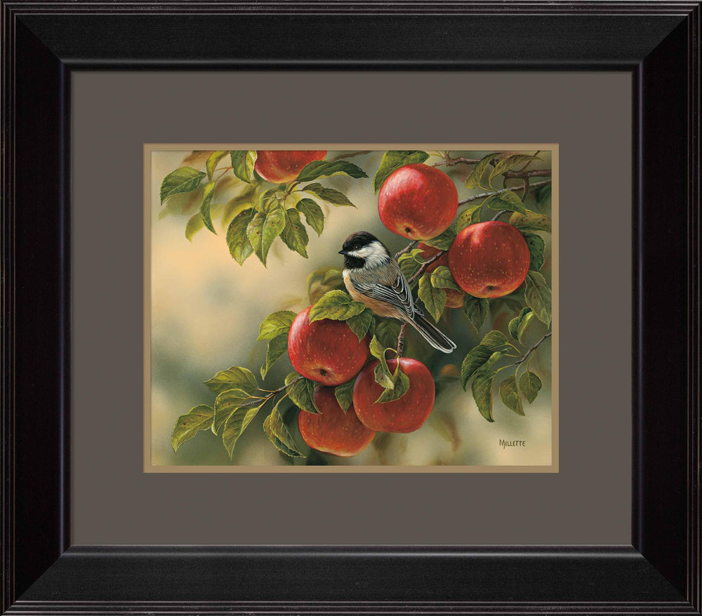 While visiting an orchard we were taken with the beauty and looked to pair this fruit with songbirds. Black-capped chickadees were the first to come to mind.