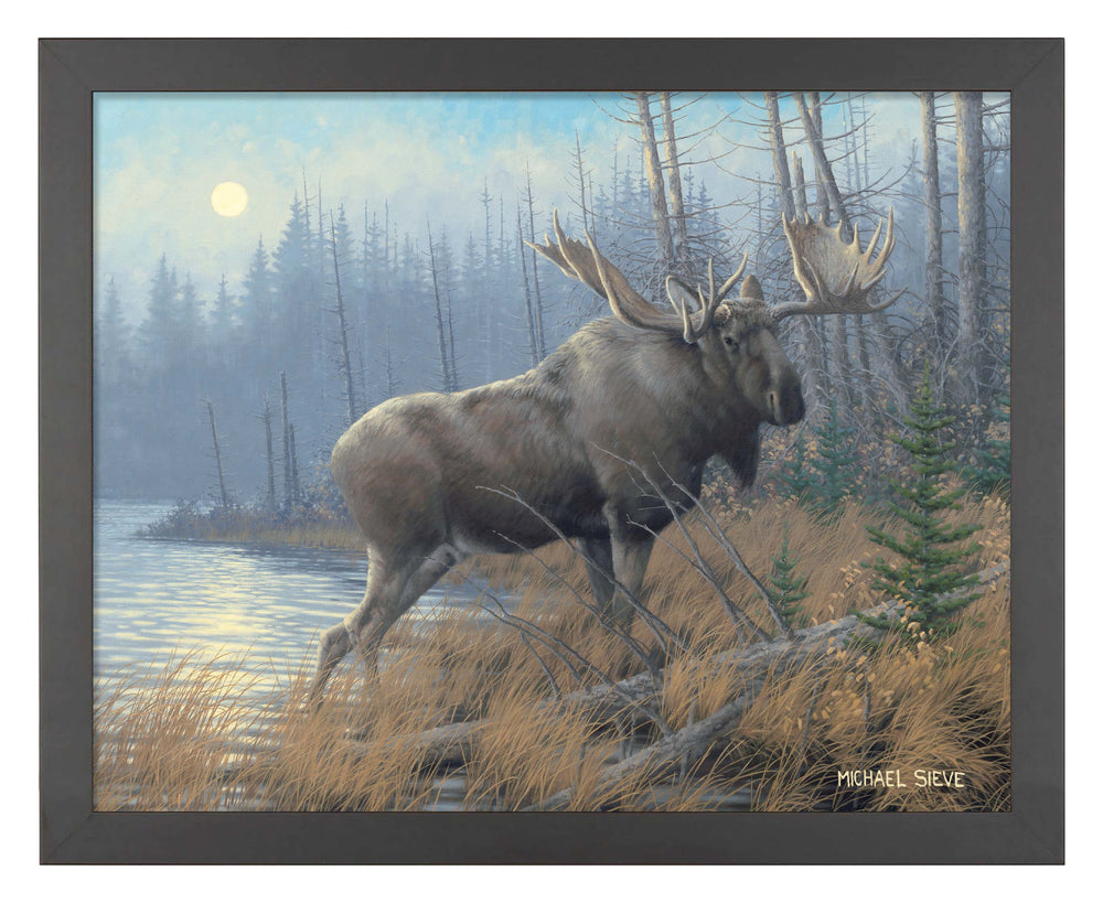 A majestic bull moose steps out of a lake with the moon in the background, a bald eagle flying over the water on the left and an owl perched in a tree on the right.