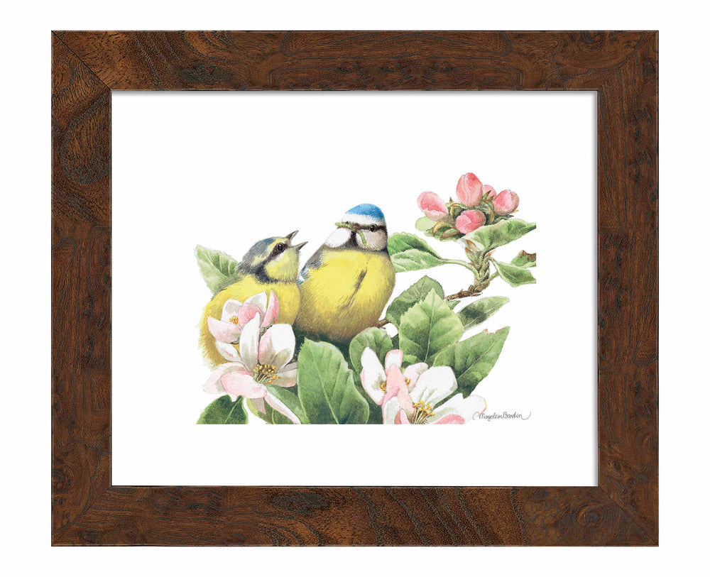 Our orchard seems to be a popular spot for the Eurasian blue tit fledglings. Some are hopping along the ground, others have found a spot in the blossoming tree. Patiently waiting for a parent to return with a bite to eat. As soon as I saw the fledgling in the blossom I knew I had to paint it…so sweet!