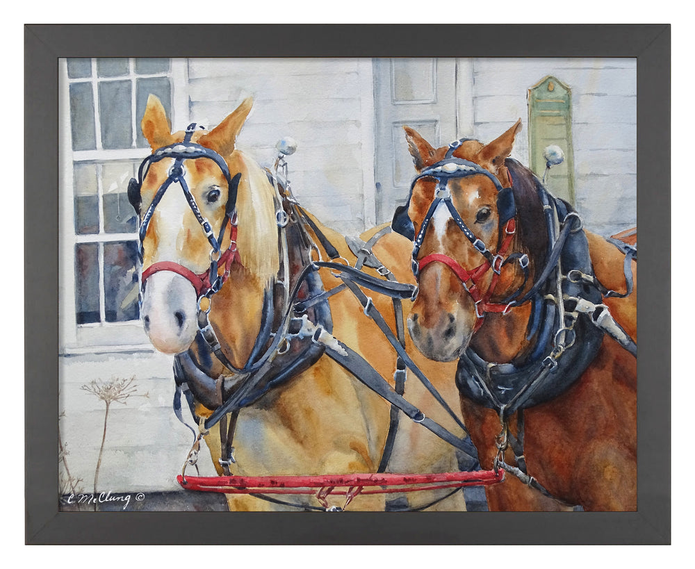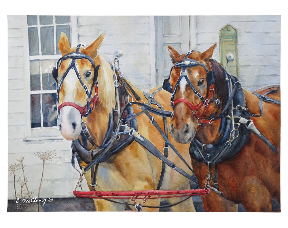 A pair of horses all dressed up for a parade on Mackinac Island.