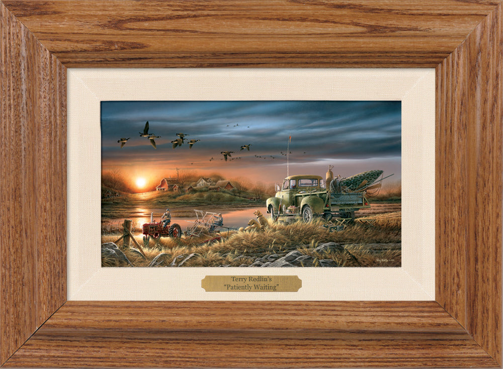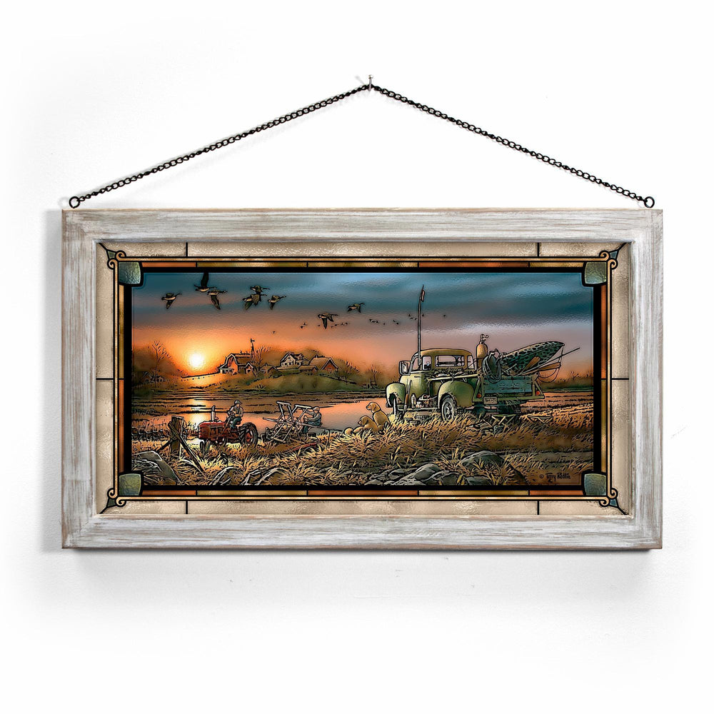 As the sun sets behind a hillside barn, two hunting dogs patiently wait for the farmers to finish harvesting. Overhead, a flight of honkers head for their evening resting place. The old pickup truck carries all necessary gear: shotgun, decoys, boat, lunch and welding equipment (handy for quick in-the-field repairs). Note the fishing pole topped with a red flag. You only need to lose your truck once in the tall slough grass! This classic scene nostalgically revisits a new remote rural way of life experienced by few, but fondly remembered by many.
