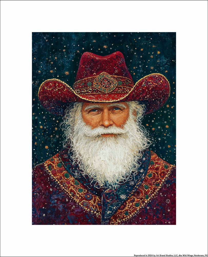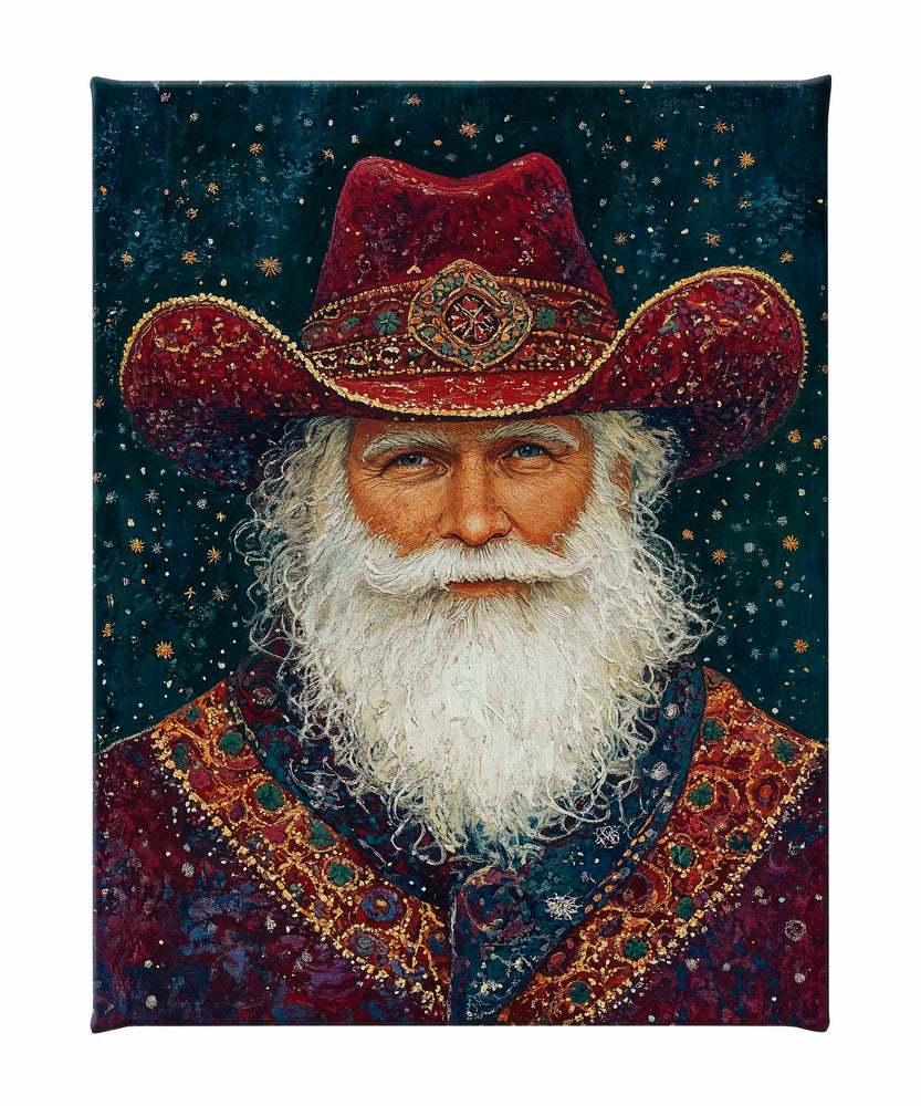 "Portrait of Mr. Claus" presents a captivating fusion of Western Americana and traditional Christmas imagery. This unique interpretation of Santa Claus reimagines the iconic figure as a rugged yet jolly cowboy. The artwork centers on a close-up portrait of a white-bearded man with twinkling eyes and a warm, gentle smile that immediately evokes the spirit of Father Christmas.