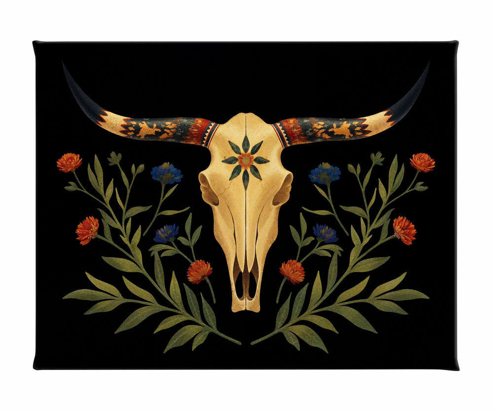 The horns, stretching outward, bear subtle yet vivid patterns that evoke the colors of the prairie at sunset—warm earth tones merging into the fiery hues of twilight. Surrounding the skull are meticulously painted flowers, perhaps marigolds and cornflowers, symbolizing life, death, and the cyclical nature of existence. The greenery adds a sense of vitality, suggesting that even in death, life persists and flourishes.