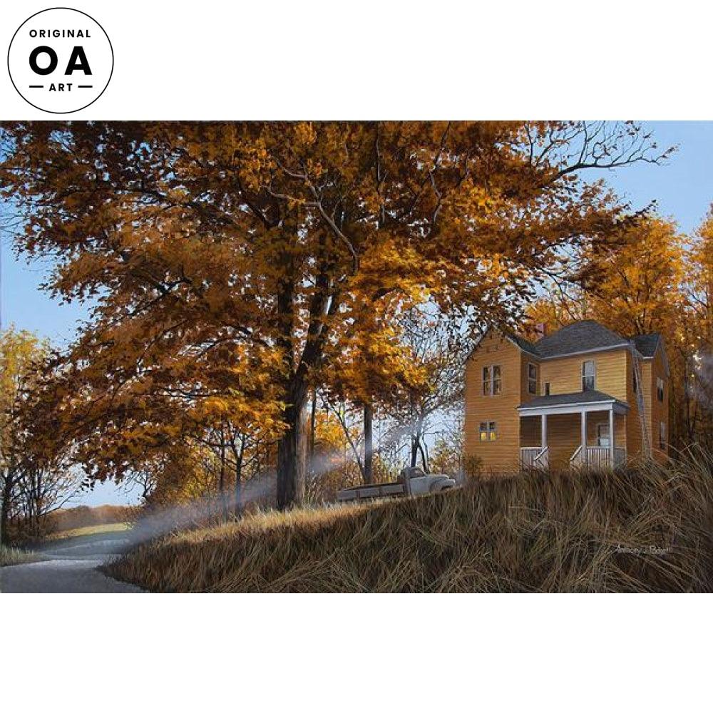 This is a painting of my childhood home. While our homestead was in the city of Belleville, IL, I always wished it was tucked away in the countryside... so I created this fall scene in my mind. Built in 1893, the homestead needed diligent maintenance to ensure its survival and maintain a small part of our midwestern architectural heritage. The ladder and the 1950's work truck capture one of those necessary moments of preservation in the home's 125 year history.