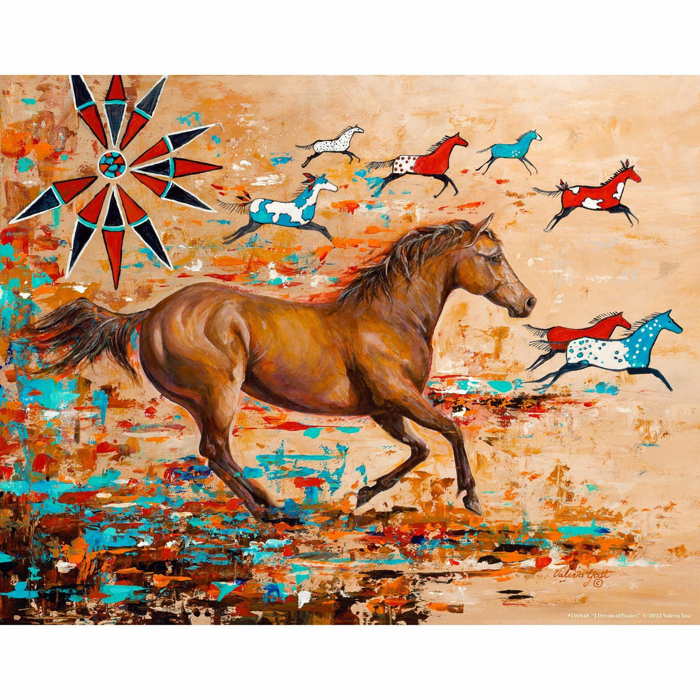 A thunder storm in the distance gives these horses an excuse to run. Painted to celebrate their owners exploits and to enhance their capabilities, the horses show off their beauty and grace. Whether riding, watching or painting them, horses are my favorite animal.