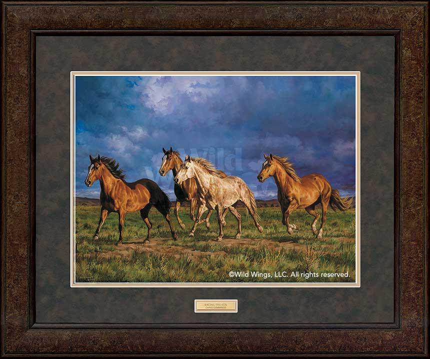 The setting sun casts long shadows as these horses race across the open range, the gold highlights of their coats gleaming in the sun.