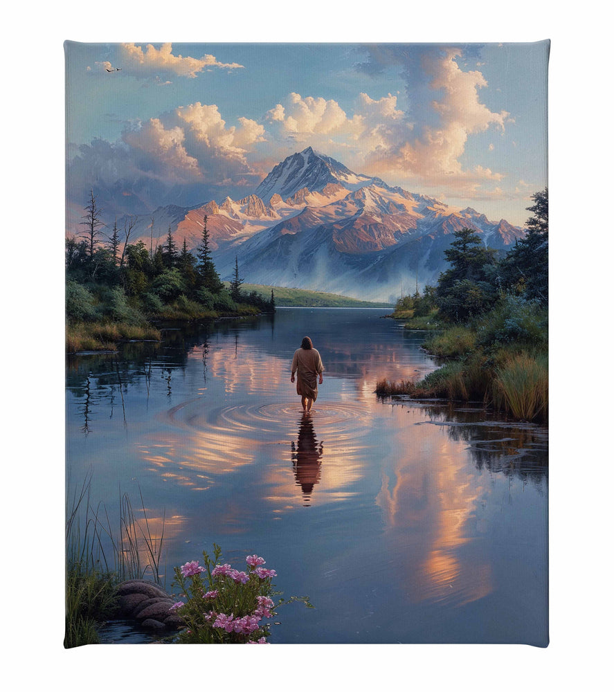 Reflection of Glory is a serene and awe-inspiring landscape painting that depicts a figure walking through calm waters, surrounded by a majestic mountain range. The mountains, bathed in the golden light of sunrise or sunset, are reflected in the still waters, creating a mirror-like effect that adds depth and tranquility to the scene. The clouds above the mountains are lit with soft pinks and blues, harmonizing with the reflections in the water.