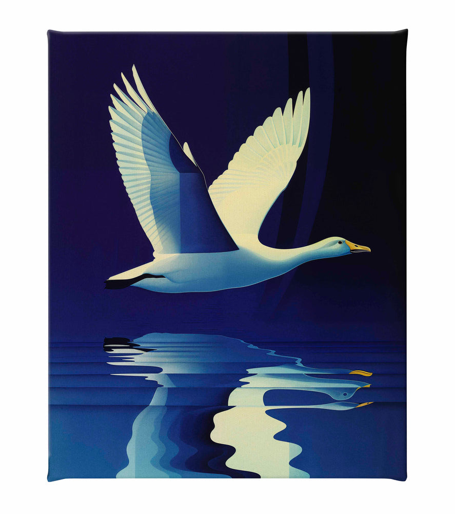 Reflections in Flight - Swan Over Tranquil Waters is a mesmerizing painting that captures the graceful beauty of a swan in mid-flight, gliding effortlessly over calm, reflective waters. The swan's pristine white feathers are highlighted against a backdrop of deep, serene blues, creating a striking contrast that emphasizes the bird's elegance and purity.