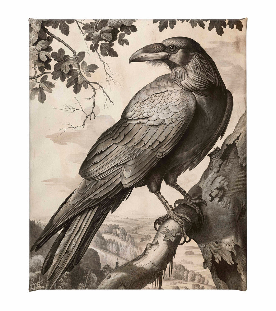 Regal Observer - Raven in Woodland Vista is an exceptional piece from the Engravers Choice Collection. This artwork features a majestic raven perched on a gnarled branch, overlooking a serene and expansive woodland landscape. The intricate linework and shading bring the raven to life, capturing the texture of its feathers and the contemplative intensity of its gaze.