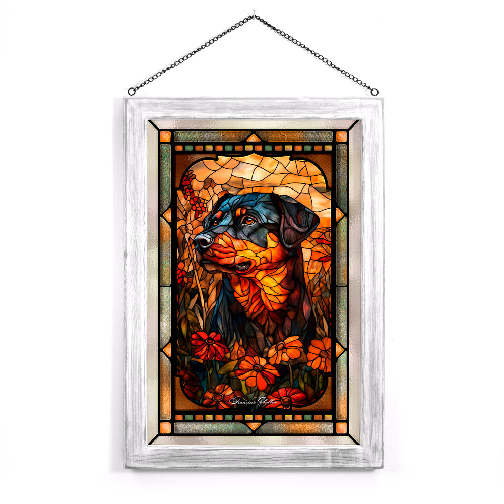 "Rottweiler" captures the strength and loyalty of this iconic breed through a rich and dynamic stained glass-inspired design. The Rottweiler's powerful yet calm demeanor is beautifully highlighted amidst a vibrant field of red and orange flowers, with golden sunlight casting a warm, radiant glow over the scene. Intricate detailing emphasizes the dog's muscular build, soulful eyes, and striking black-and-tan coat, harmonizing with the natural beauty of the surrounding blooms and foliage. This artwork celebrates the Rottweiler's noble character and enduring elegance, blending its imposing presence with the tranquil charm of nature in a captivating and timeless piece.