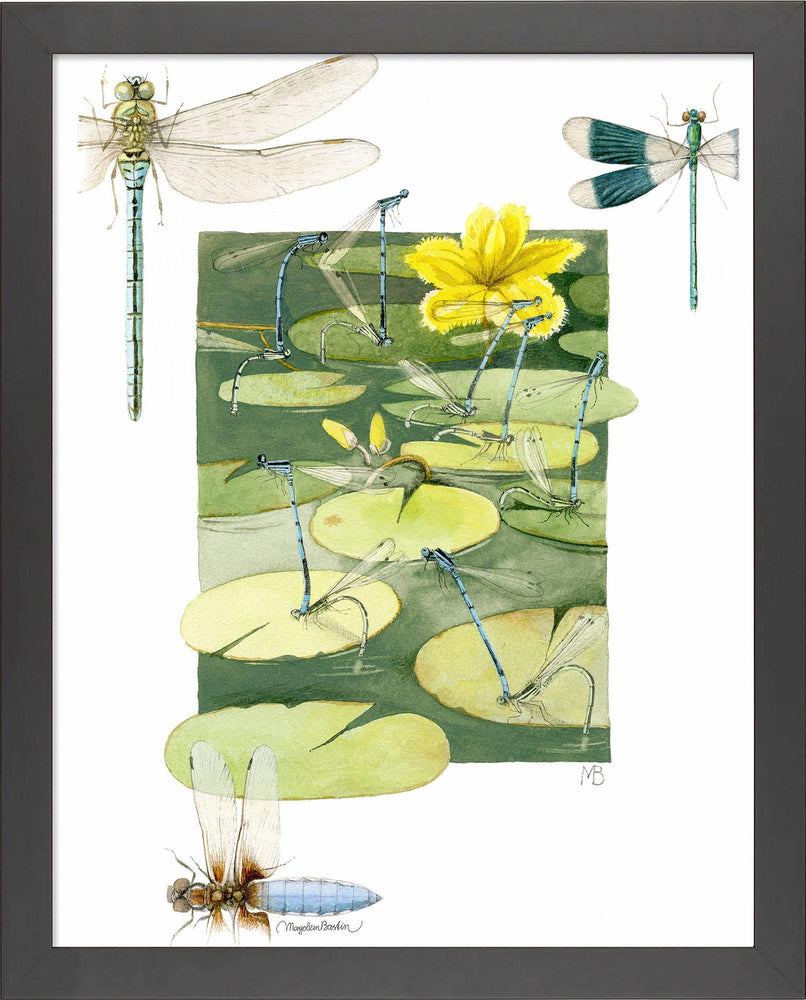 It's June and around the pond that means rush hour! It is teeming with damselflies, broad-bodied chasers and darners. All varieties of dragonflies. Large eyes, strong legs…perfect for hunting other insects. The aeshnas, or mosaic darners, are the largest dragonflies we see above our pond. The males are zigzagging across the pond like fighter jets chasing off other males in pursuit of a female. I've spotted an Emperor dragonfly as well and counted at least forty skins stuck on reeds where the nymphs emerge as dragonflies. The Broad-bodied chaser has one particular reed stalk from which he hunts flies, mosquitos and small butterflies. He aggressively defends his territory from other dragonflies.