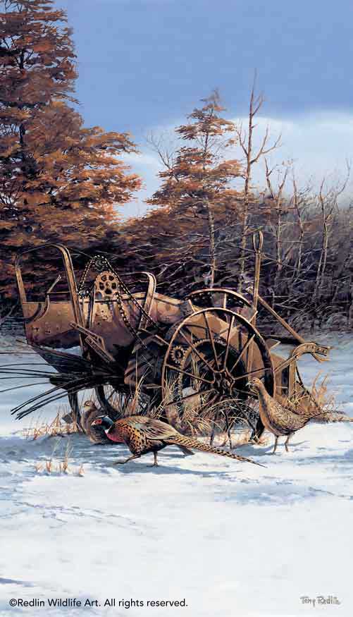 A trio of ring-necked pheasants find shelter in the lee of an old potato digger.