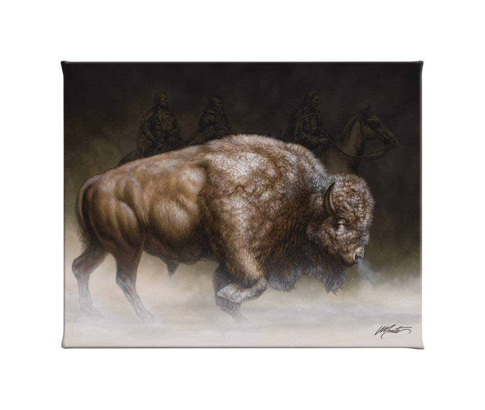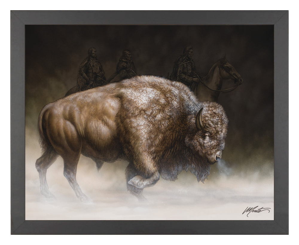 Sacred is a powerful depiction by artist Monte M. Moore of the Lakota tribe legend of the return of the 'white buffalo' as he is guided back to ’the people’ as a sign of returning prosperity to the tribe as they struggled to maintain their way of life as the Great Plains herd of bison slowly disappeared from the American landscape.