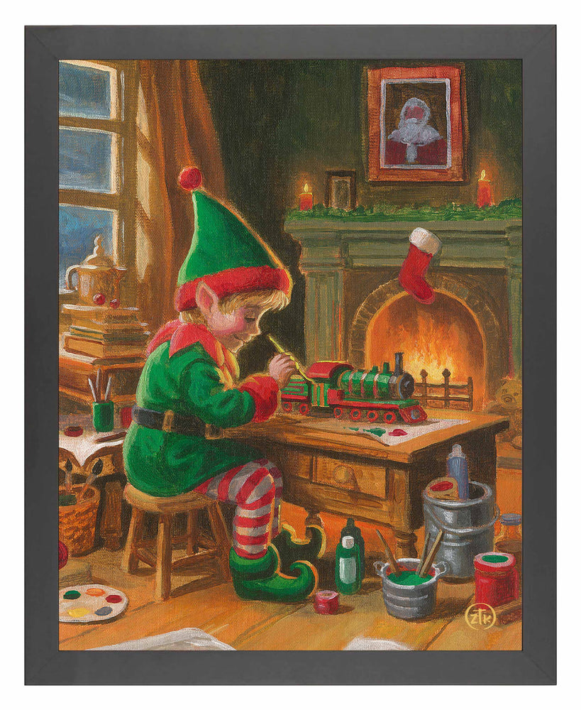 While the magic of Old Saint Nick fills the hearts of all those who love Christmas, he is not the only one responsible for our yule-tide holiday traditions. Indeed, he may deliver the toys to the millions of deserving children who are listed on his "nice" list but, it is the North Pole Elves that make the gifts in the amounts needed to fill the space under the tree. Santa's little helpers are there to launch Santa and his bountiful sack on his hurried flight to the houses of all believers. Put simply, he needs them to fulfill his Christmas Eve calling. I try to capture both the enchantment and practical effort of these magic helpers in my latest holiday painting, Santa’s Little Helper.