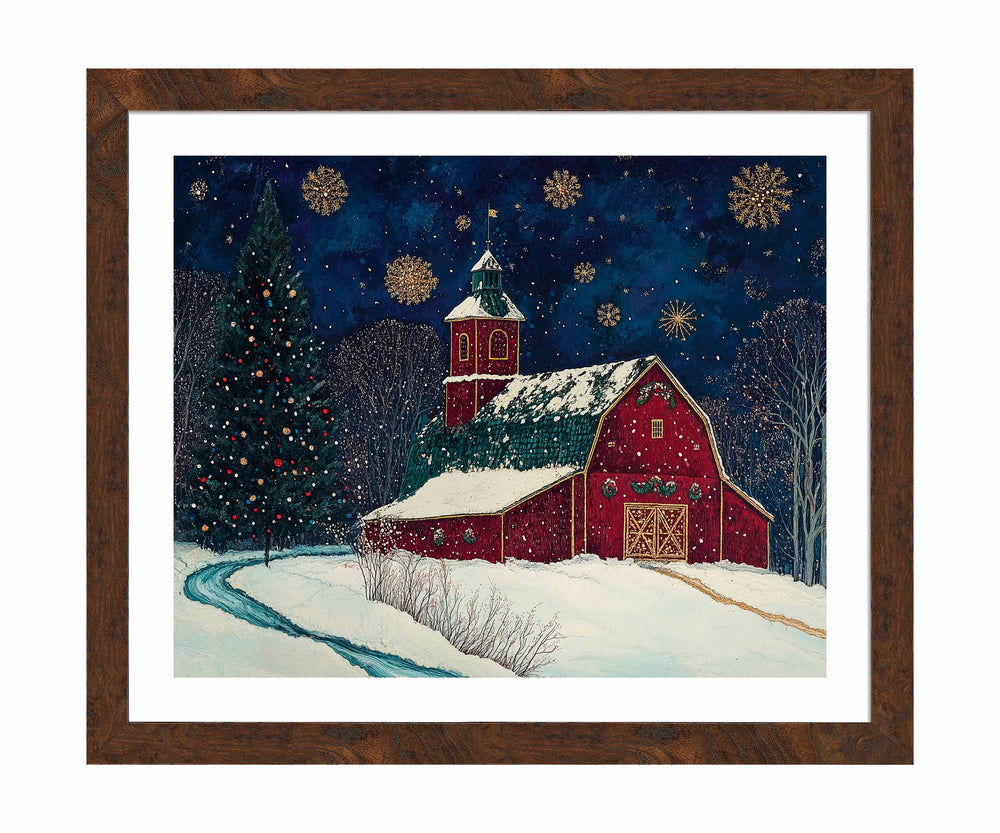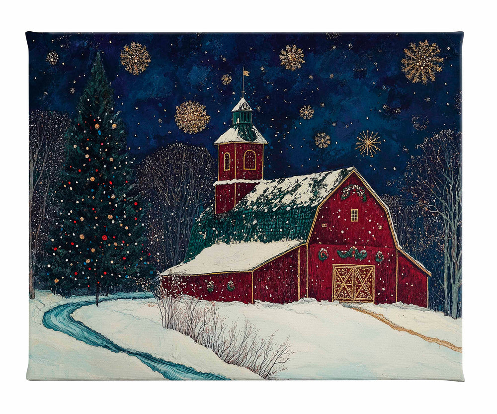 The color palette is dominated by the deep red of the barn, the cool blues of the night sky and snowy ground, and the warm golds of the snowflakes and lit windows. This combination creates a cozy yet magical atmosphere that captures the essence of Christmas wonder.