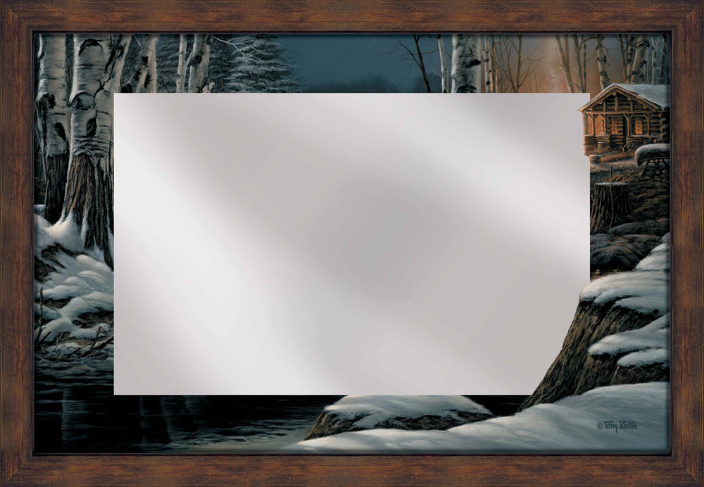 In this idyllic scene the artist invites us to share, along with the cabin inhabitants and their camping visitors, one of those rare nights in the deep woods. The high moon has momentarily broken out from the clouds, turning the snowy landscape to bright day. The surrounding silence provides, for those of contemplative nature, a perfect setting for the primitive message contained in the flickering campfire.