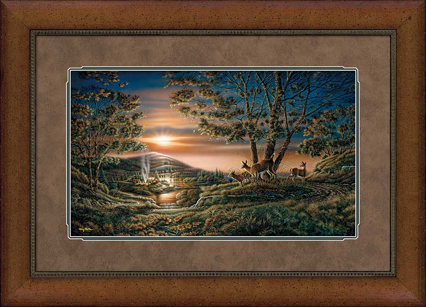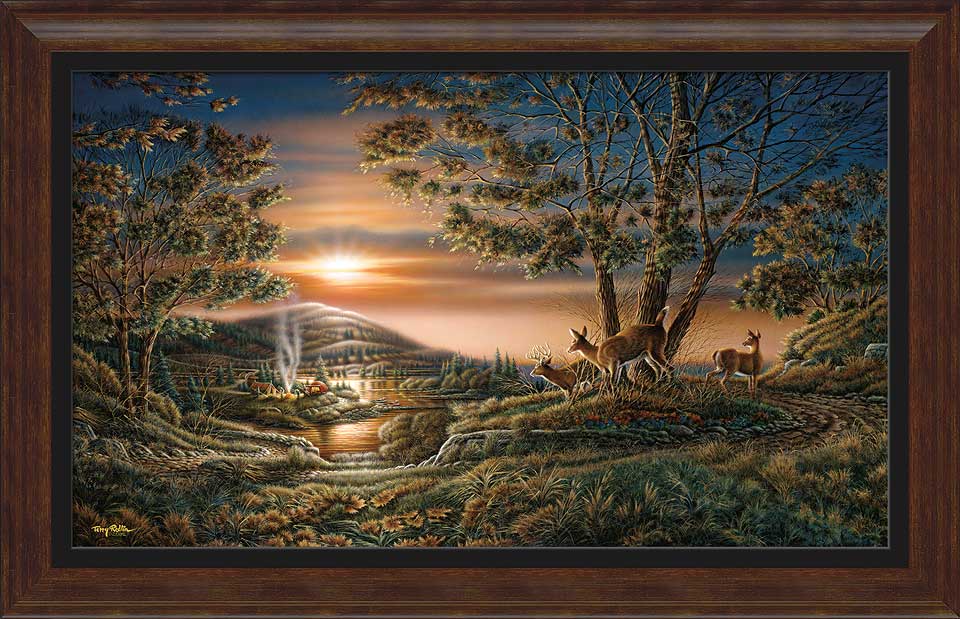 I started this painting last year with an idea I'd had for years, relates Terry Redlin. As these deer watch from a distance, they are curious and accepting of the small group of fishermen setting up camp. Man and his friends can together truly enjoy the beauty of day's end as the ever-changing lights at sunset create a colorful display over the land and water. Each sunset is unique and I have been driven to capture each one's individual glory in my works.
