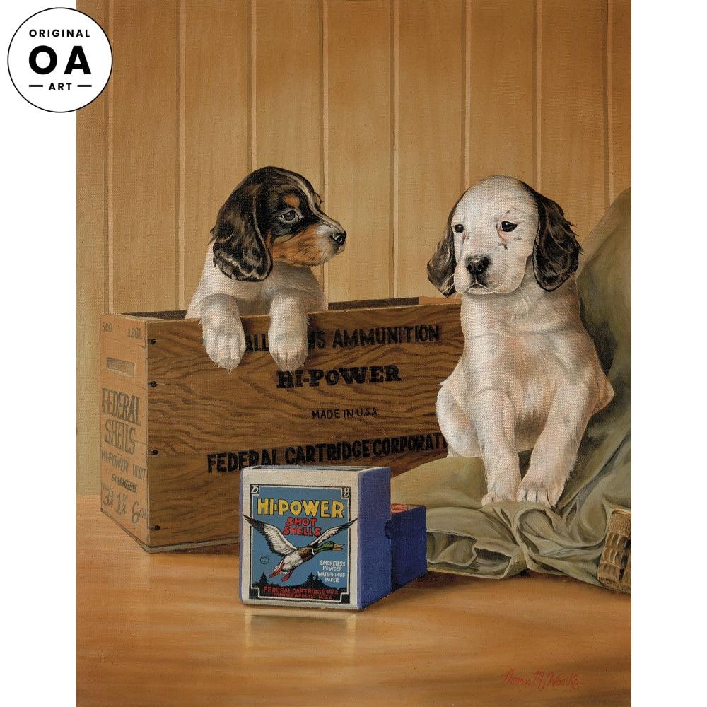 Original acrylic painting of two puppies sitting beside an old ammunition box and a smaller box of shot shells.