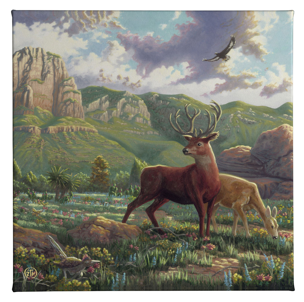 The majesty and beauty of our country's national parks has long been part of my artistic imagination. Even as a child when I began visiting these untamed places their emotional impact on me was real and profound. Those early transformative experiences were only furthered when I grew to fully appreciate the works of other artists and their interpretations of these natural treasures. Fredrick Church, Albert Bierstadt and, of course, my uncle Thomas Kinkade all came to influence my own efforts in oil seeking to capture what I was seeing and feeling inside. In the first of my America's Wildlands series, I explore a little-known region in my home state of Texas that is protected within Guadalupe Mountains. Set at sunrise as the park's inhabitants just begin to stir, the background is dominated by "El Capitan" the best-known peak of the Guadalupe range. Mule deer and road runners forage for food as a golden eagle flies above and scans the ground below. Splashes of color dot the landscape in the petals of bluebonnets and Indian paintbrush as well as on the wings of monarch butterflies. It is spring in Guadalupe and a moment of verdant green hangs on before the coming summer heat has chance to grey the rocky terrain. My plan is to visit many of our nation's parks over the coming years and chronicle the sights, the flora and the fauna of each for those of you who would enjoy my captured moments. And, as always, I want to thank you all for sharing my adventure in art.