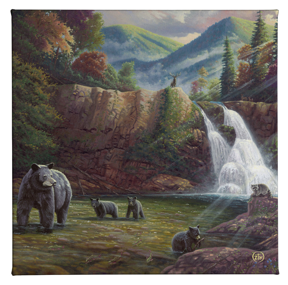 In Spirit of the Smokies, I once again take time to explore America's Wildlands and pay homage this nation's majestic parks. It is my second effort in this series. Situated along the border of Tennessee and North Carolina, the Appalachian and Blue Ridge Mountains serve as backdrop to my selected mountain scene. As Abrams Falls splashes behind, a mother black bear and her three cubs forage the flowing stream for food and fun. A mountain raccoon takes a moment to watch the furry family while it holds on to its dinner in the form of a brook trout. Standing above it all, a North American elk looks down on its fellow woodland denizens as it is silhouetted against the shifting mists and striking foliage of this ancient forest habitat. I have visited the Smoky Mountains on many occasions and I am always struck in wonder at the beauty of the area. As you hike these hills, you will see subtleties of light and color that can truly inspire artistic vision. It is also a place rich in a unique culture and an unabashed appreciation of the simple life so far removed from the chaos of the city. I hope you all can find some time to join me as I take my own moment to reflect and recenter myself in the Smokies and this sun drenched hallow. And, as always, I want to thank you all for sharing my adventure in art.