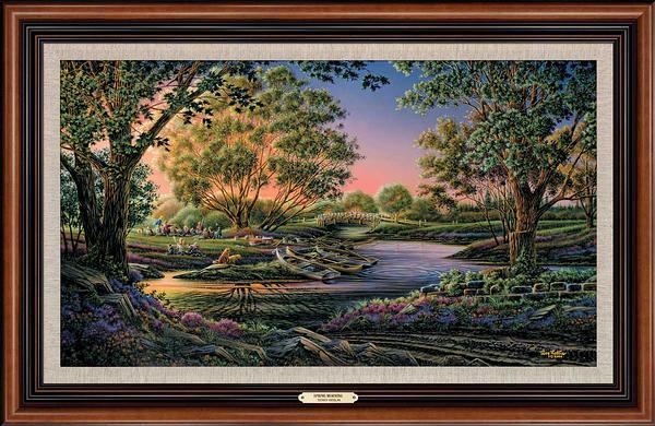 In this idyllic scene, on this warm spring morning, Terry Redlin asks us to consider both the wonders of nature and the many caring people who work to maintain its splendor. Here in a cathedral of over-arching trees, near altars of sweet smelling flowers, young students and their teachers consult the health of the river’s newly flowing waters. The youngsters test the water’s purity and compare it with previous years. They collect samples of insect populations for signs of unique new arrivals. In the glory of this secluded setting, they learn how to preserve its pristine beauty. “It is a tribute to conservationists, both old and those in training,” the artist says, “who seek to preserve our precious environment for the generations to come.”