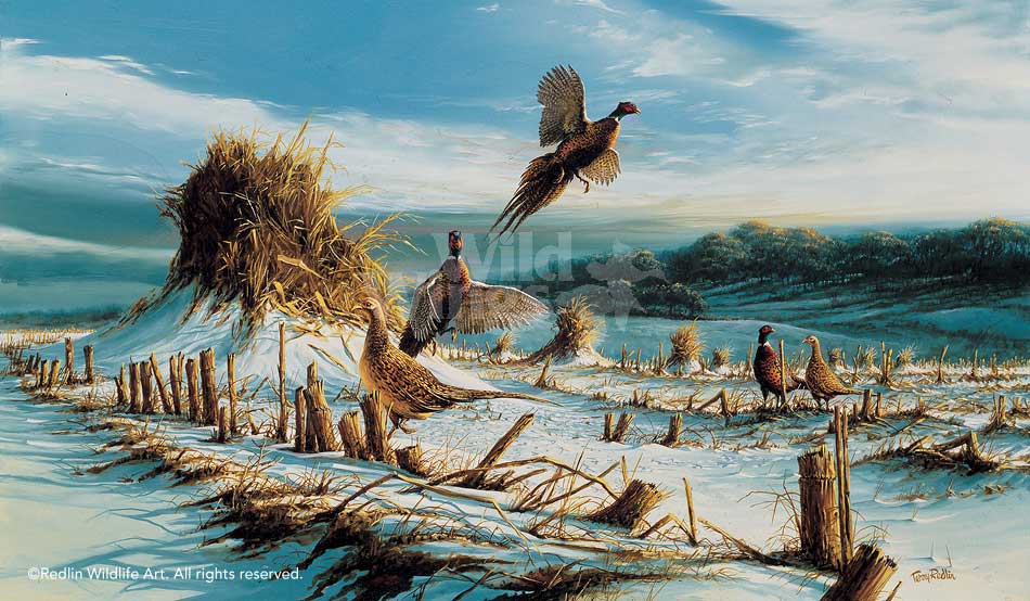 The peacefully feeding ring-necked pheasants have been caught off guard and break the still winter air with a flurry of sound and action. This corn patch was an actual field, hand planted and harvested with an old corn binder, then laboriously collected into large shocks. The artist found the setting a unique contrast to the straight rows and clean cuts made by modern farming equipment.